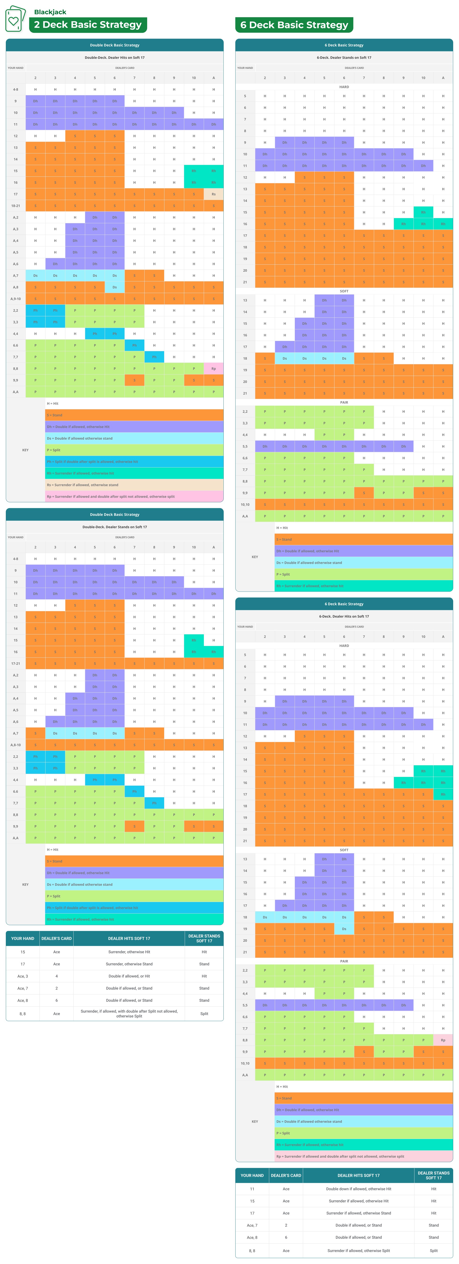 These two are the 6-deck shoe versions of the Blackjack Cheat Sheet. The first one is for when the dealer hits a soft 17, and the second one is for when the dealer stands on a soft 17.