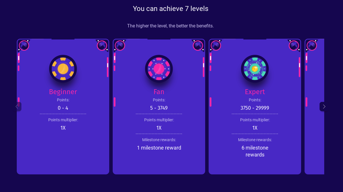 VIP club welcomes all the players who want to get high-quality VIP service. Exclusive privileges and special promotions are available. With VIP program you join a grand adventure of 7 levels and unlimited milestone rewards and points for every spin.