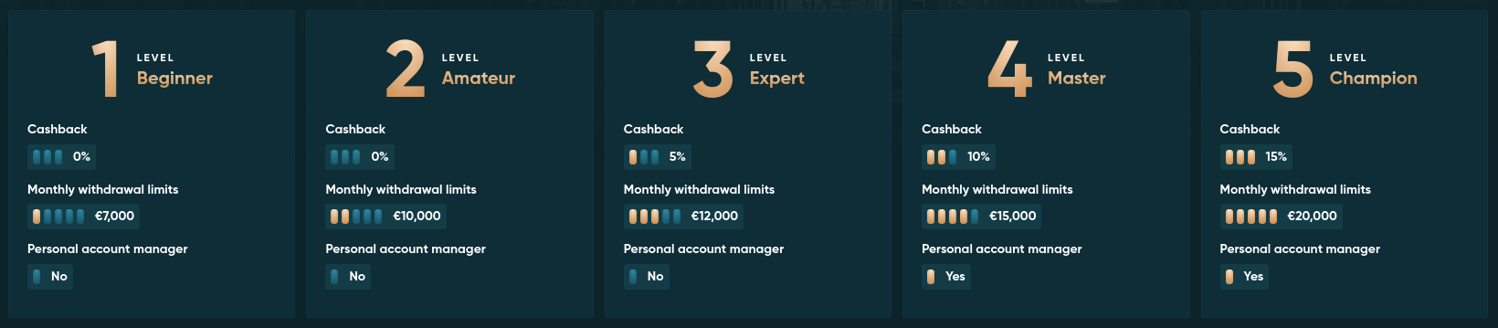 - €500 per day (Vip Level 1)€7000 per month (Vip Level 1)€500 per day (Vip Level 2)€10000 per month (Vip Level 2)€800 per day (Vip Level 3)€12000 per month (Vip Level 3)€1000 per day (Vip Level 4)€15000 per month (Vip Level 4)€1500 per day (Vip Level 5)€20000 per month (Vip Level 5)