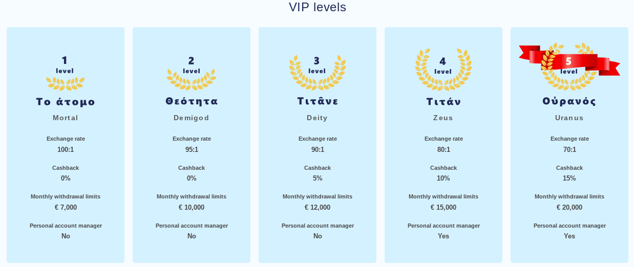 VIP club welcomes all the players who want to get high-quality VIP service. Exclusive privileges and special promotions are available. With VIP program you have high withdrawal limits of funds in record-breaking short terms. Other amount based benefis: Extended monthly withdrawal limits depending on the VIP level.
