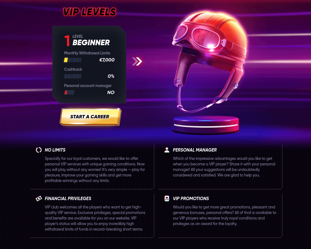 VIP club welcomes all the players who want to get high-quality VIP service. Exclusive privileges and special promotions are available. With VIP program you have high withdrawal limits of funds in record-breaking short terms, a dedicated personal manager and other amount based benefis.