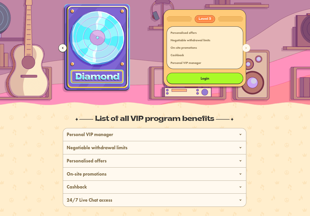 VIP club welcomes all the players who want to get high-quality VIP service. Exclusive privileges and special promotions are available. With VIP program you have high withdrawal limits of funds in record-breaking short terms. Other amount based benefis: Extended monthly withdrawal limits depending on the VIP level and a personal assistant who will accompany them throughout their journey into our vast selection of games, ensuring endless fun and a worry-free experience.