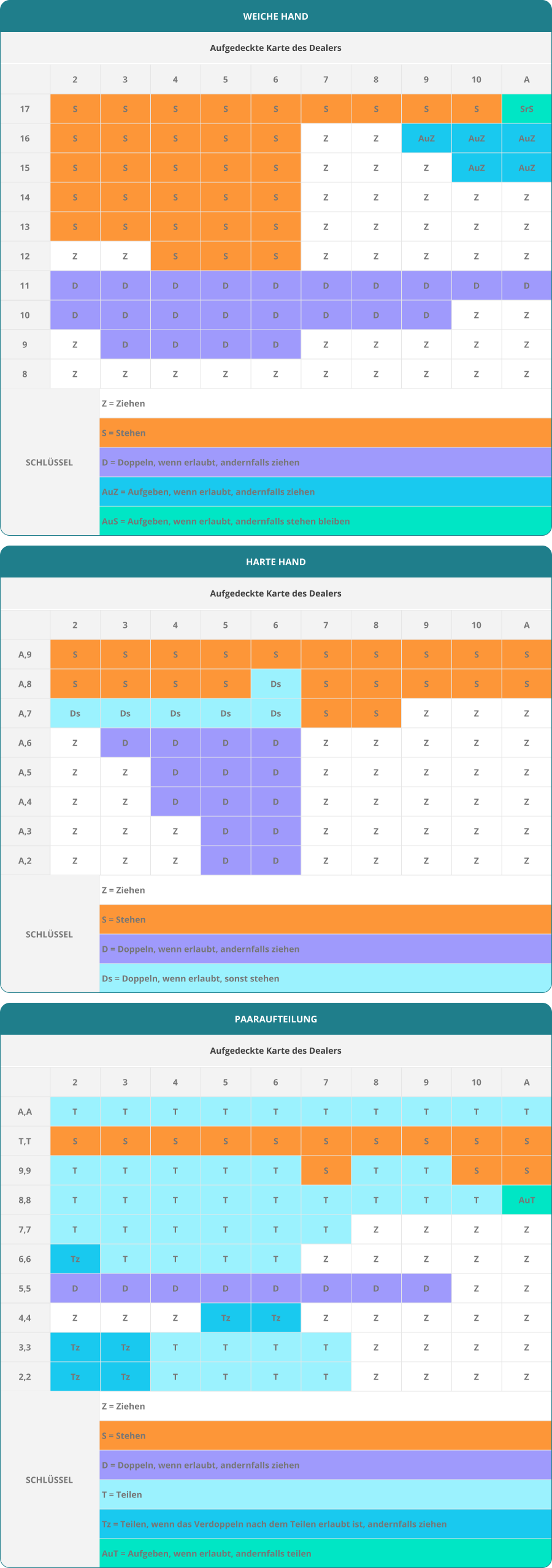 - Der Schlüssel zeigt dir, ob du Treffen, Stehen, Verdoppeln, Teilen oder Aufgeben wählen solltest;