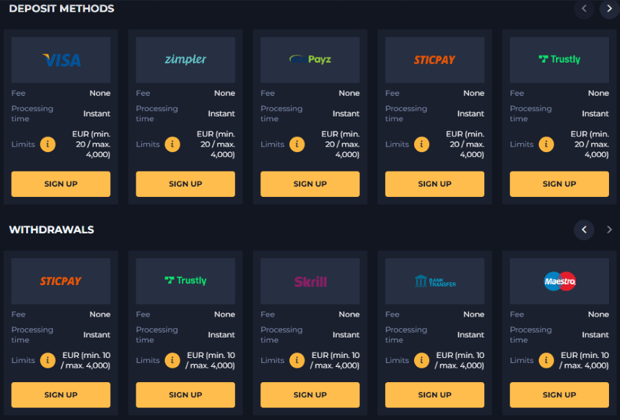 Deposit limits range from €20 to €4,000 per transaction. Withdrawal limits range from €10 to €4,000 per transaction. All payments are processed instantly.
