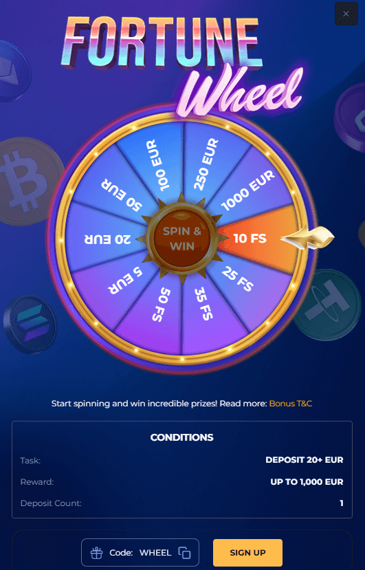Prizes range from 10 to 50 Free Spins, or from €5 to €1,000 in bonus cash. The wheel requires entry of the promo code WHEEL when depositing.