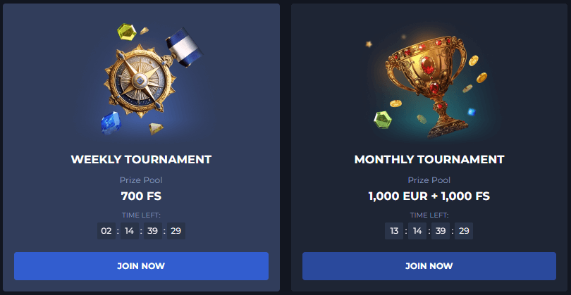 The Weekly Tournament runs from Monday to Sunday. Players earn 1 tournament point for every €1 wagered on slot games. Points are accumulated throughout the week, and prizes are distributed to the top 10 participants. Free Spin rewards range from 25 to 150, credited on selected games from BGaming and Pragmatic Play. All prizes carry a 30x wagering requirement.