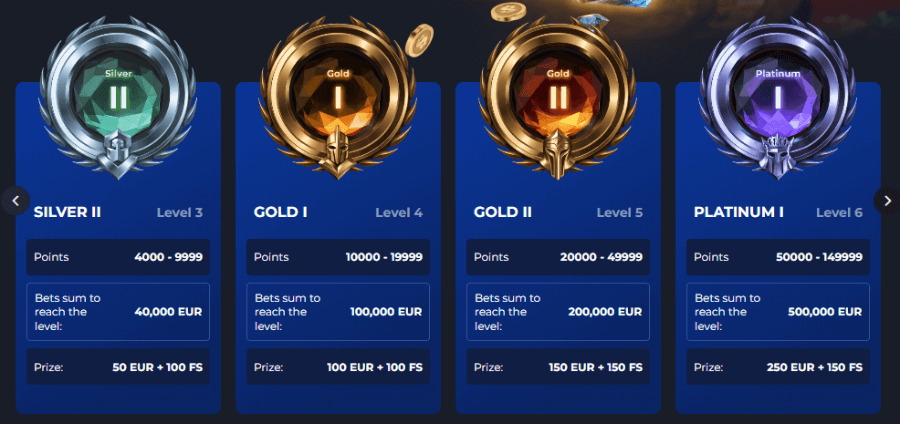 | Silver II | 4,000–9,999 | €40,000 | €50 Bonus + 100 Free Spins |