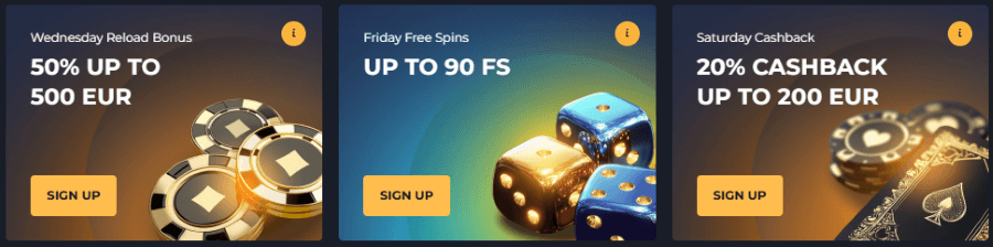 - Wednesday Reload: 50% Match Bonus up to €500; Code: WEDNESDAY;