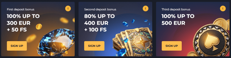 | Bronze | 150–499 | €1,500 | 50 Free Spins |
