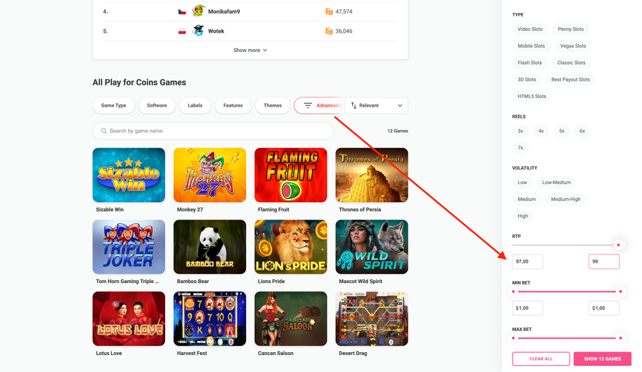 Tip: another way to search is to go to Play for coins section and in the the advanced filter set the RTP 97 and above:
