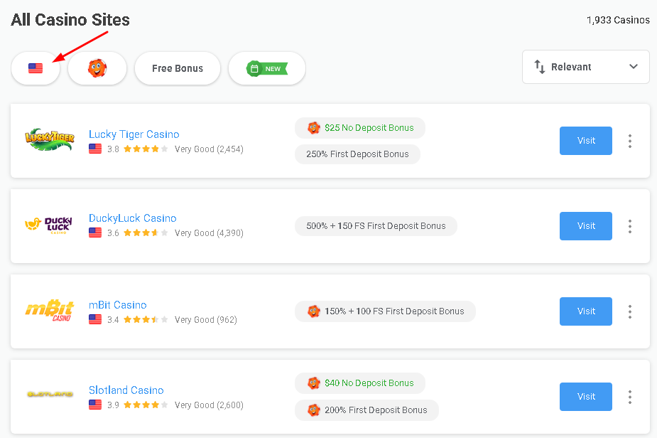Additionally, you have the option to filter casinos using the Flag filter, ensuring that you only see the casinos available in your region.